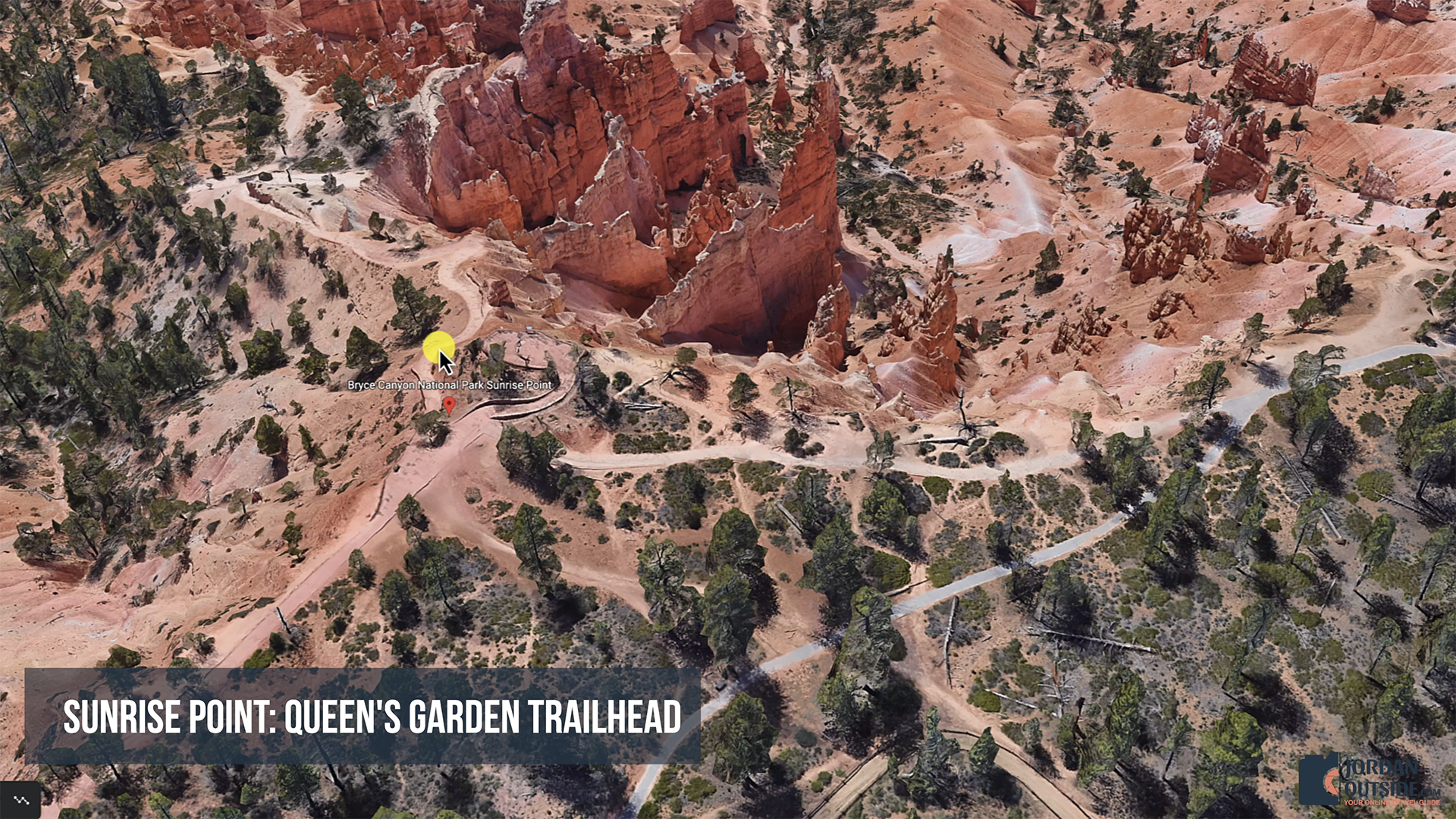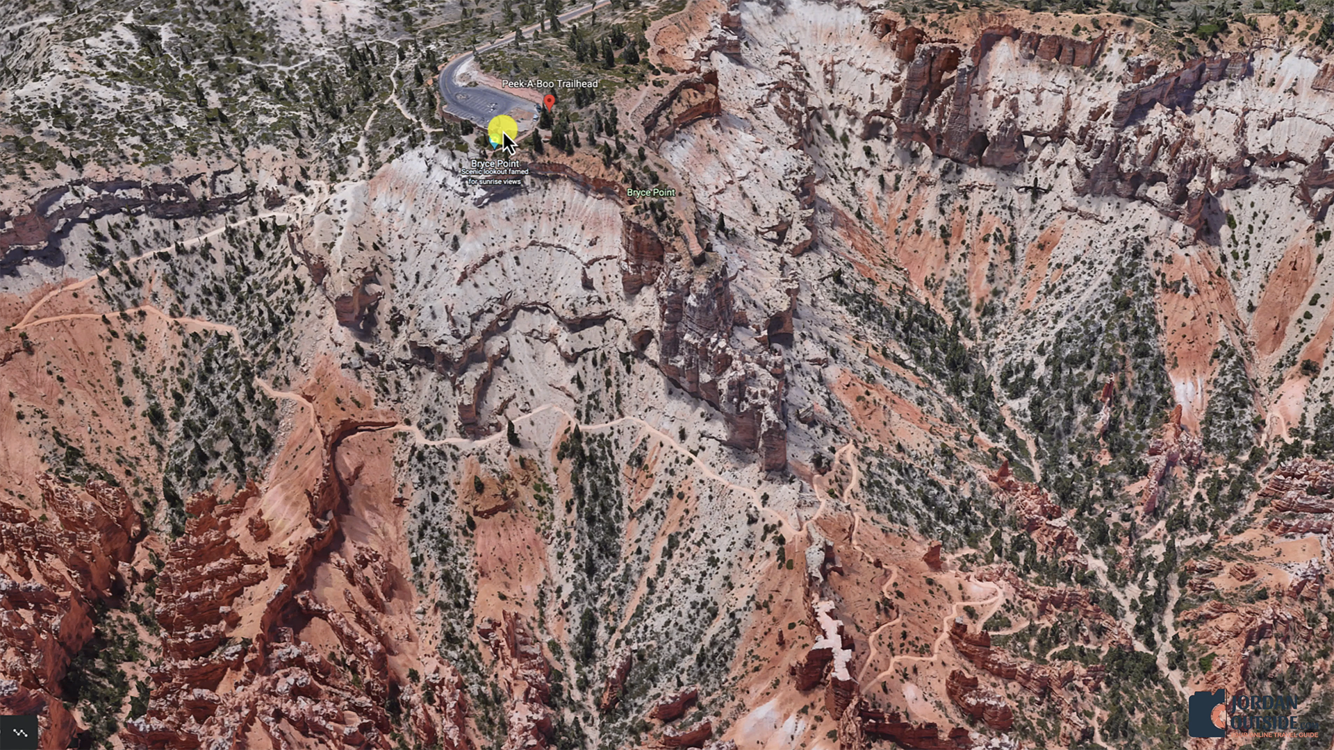 This is the overhead view from Google Earth. You can see the Sunrise Point overlook and the beginning of the Queen's Garden Trailhead.