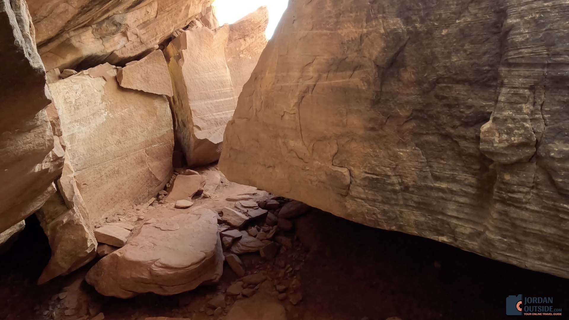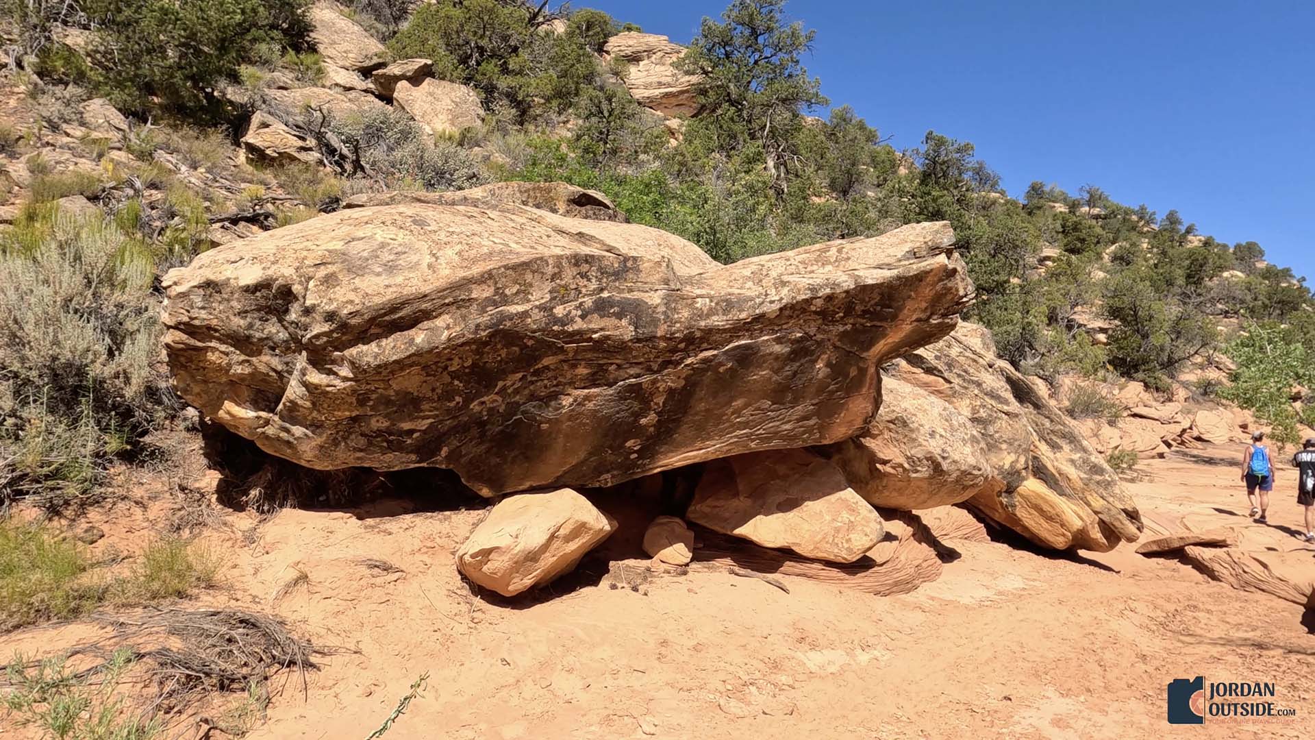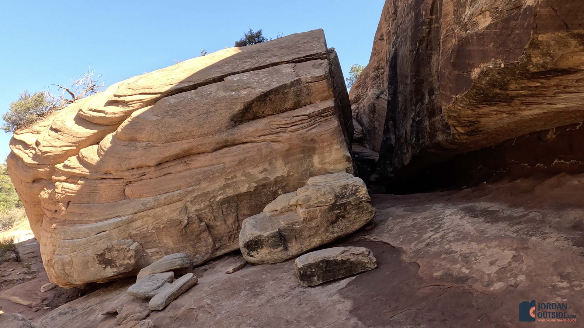 There is a large rock to the left of the indian ruins that has a walkway all the way through.